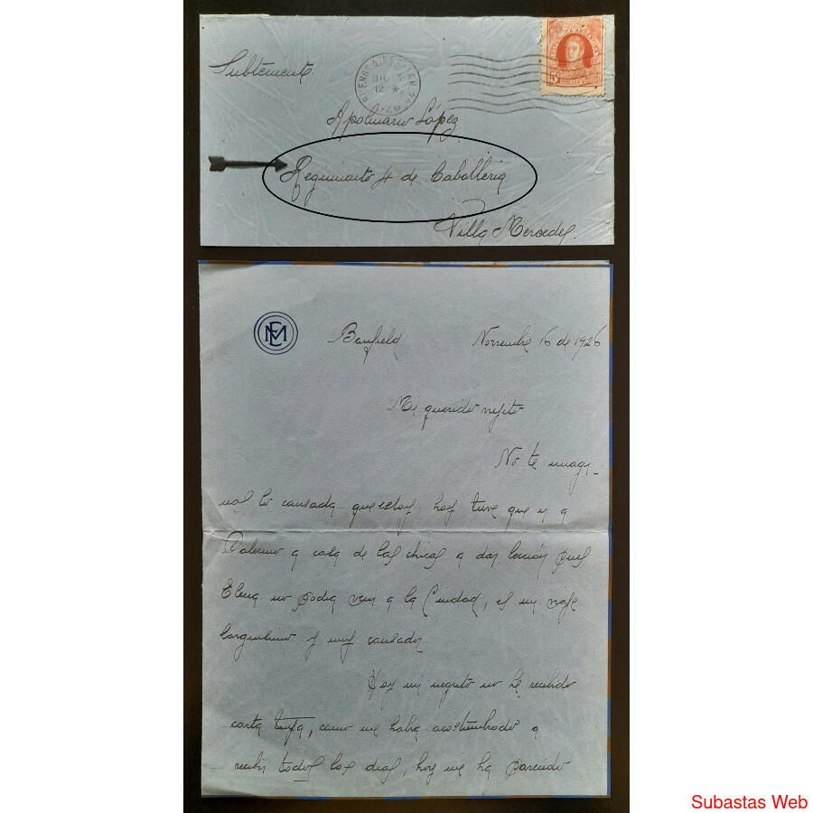ARGENTINA. 1923 / 1926 HERMOSO LOTE DE 3 SOBRES + 1 FRENTE DE SOBRE + 1 CARTA DIRIGIDAS DE BANFIELD - Bs As. CON DESTINO AL ***REGIMIENTO DE CABALLERÍA*** DE VILLA MERCEDES - SAN LUIS.