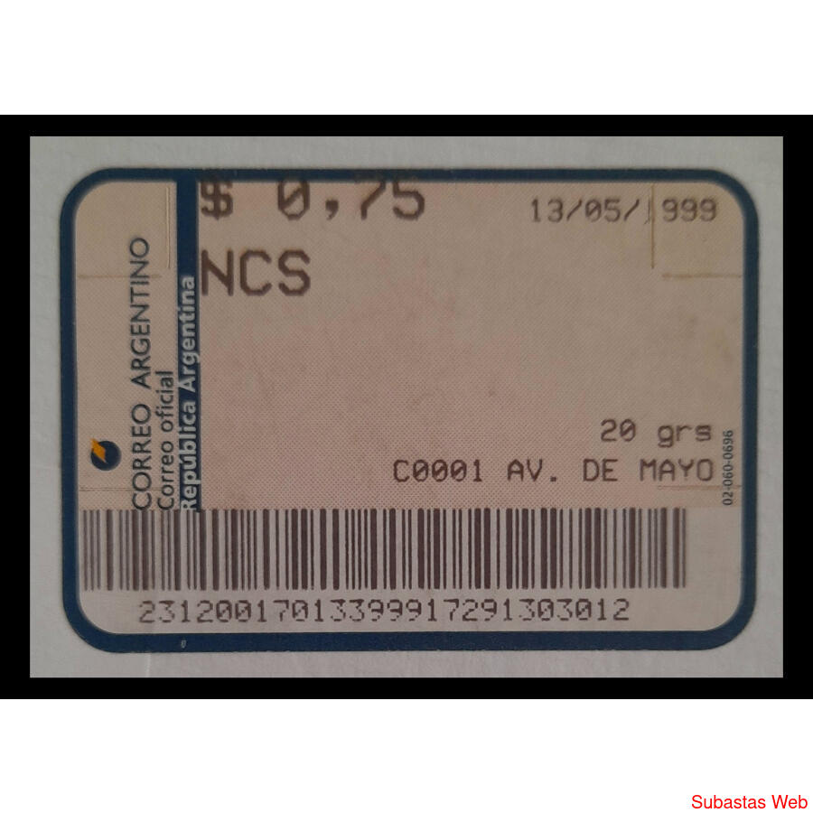 LA SEGUNDA LABEL QUE EMITIÓ EL CORREO ARGENTINO y LA MÁS DIFÍCIL DE ENCONTRAR. CIRCULADA EN MAGNIFICO SOBRE DE ****LA EMBAJADA DE ARMENIA EN ARGENTINA**** EN BUENOS AIRES CON VALOR DE 0.75 centavos (SIMPLE) EL 13 DE MAYO DE 1999.