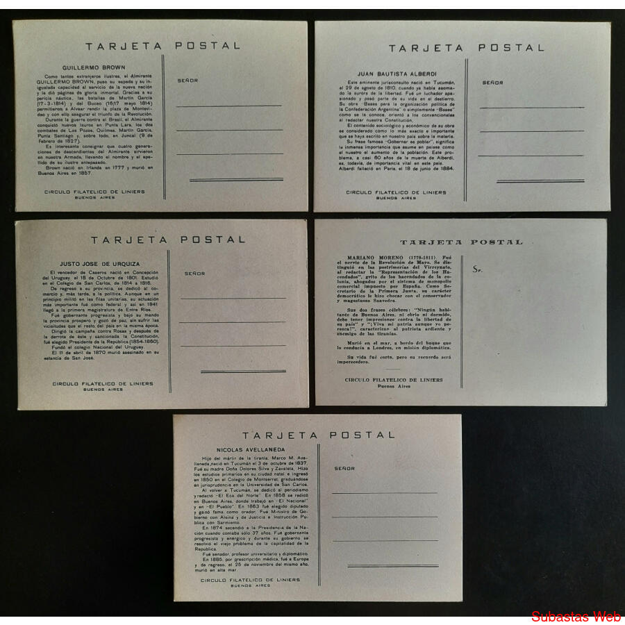 HERMOSO GRUPO de 5 TARJETAS DE PRÓCERES DIFERENTES PARA EL EVENTO y CON SU CARACTERÍSTICO MATASELLO