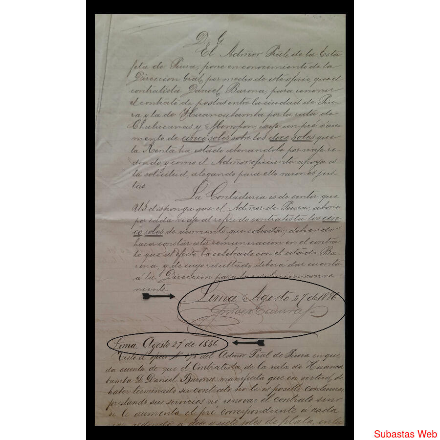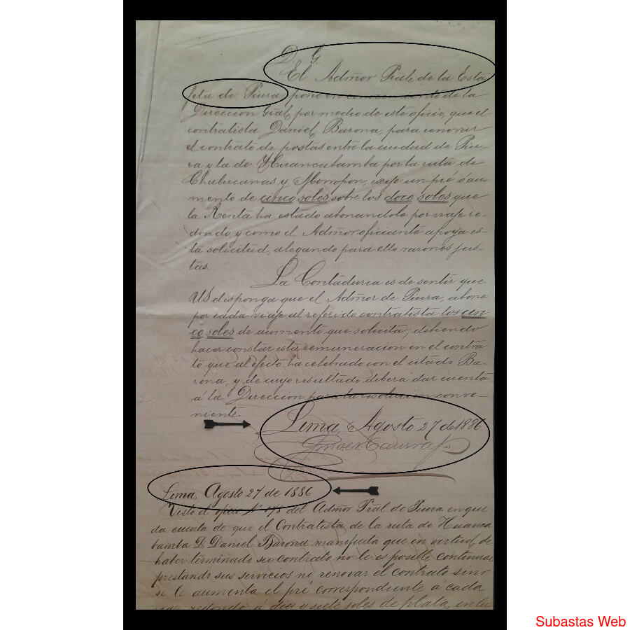 "DONDE SE COMUNICA QUE ****EL CONTRATISTA DANIEL BARONA PARA RENOVAR EL CONTRATO QUE PRESTA ENTRE ESTA CIUDAD y LAS DE LAS RUTAS QUE RECORRE SOLICITA UN AUMENTO DE 5 SOLES, ES DECIR QUE RECIBIÓ 17 SOLES EN LUGAR DE LOS 12 SOLES HABITUALES POR RECORRIDO................(y así continua con cantidad de otros comentarios y firmas)****