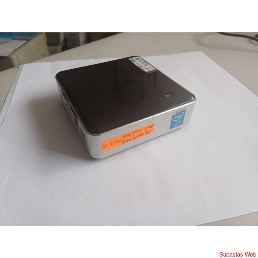 • Small mini PC with a square aluminum case (approximately ~11.6×11.2 cm) — standard for the NUC series.