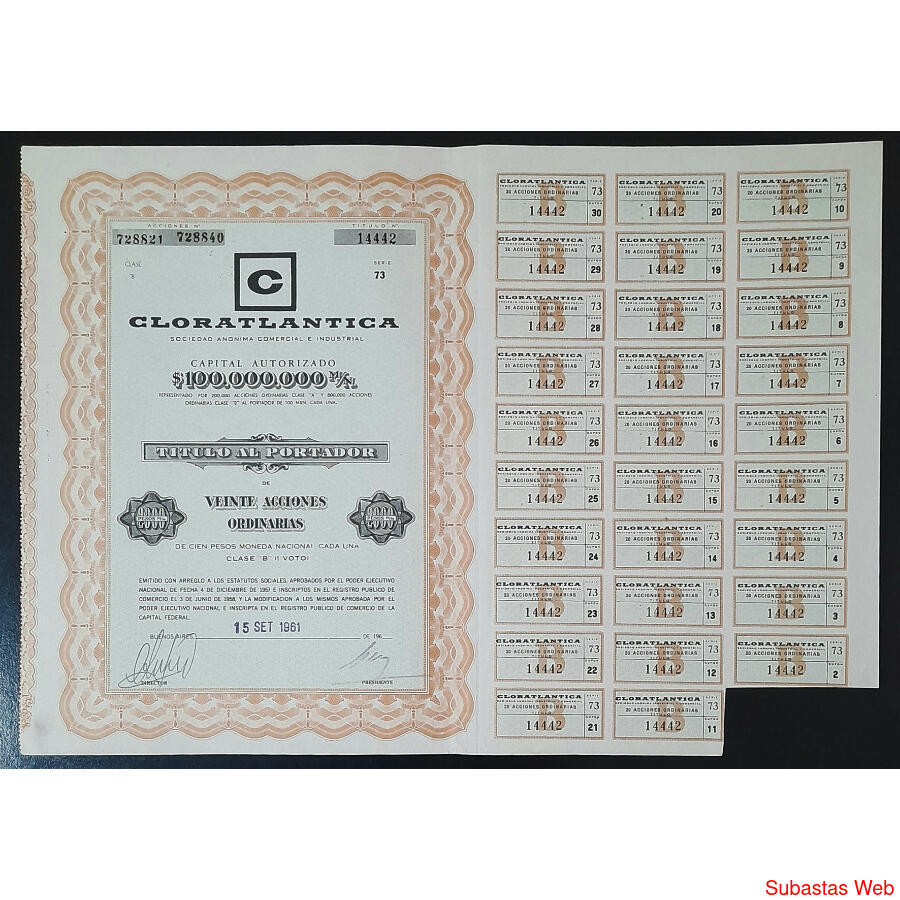 ARGENTINA. 1965 - ESPLENDIDO LOTE DE ****4 ACCIONES - TITULO AL PORTADOR DE LA FIRMA CLOROATLANTICA SOCIEDAD ANÓNIMA COMERCIAL e INDUSTRIAL****
