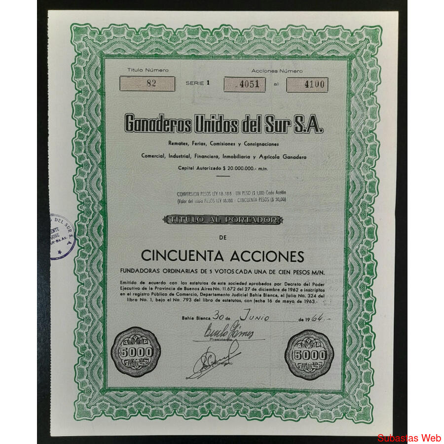 ARGENTINA. 1964 / 68 - ESPLENDIDO LOTE DE ****4 ACCIONES - TITULO AL PORTADOR DE LA FIRMA GANADEROS UNIDOS DEL SUR S.A.**** REMATES - FERIAS - COMISIONES - CONSIGNACIONES - COMERCIAL - INDUSTRIAL - FINANCIERA - INMOBILIARIA y AGRÍCOLA GANADERA.