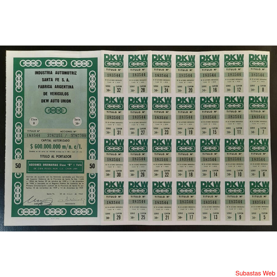 ARGENTINAS 4 ACCIONES AL PORTADOR DE AUTO UNIÓN - DKW. LUJO!