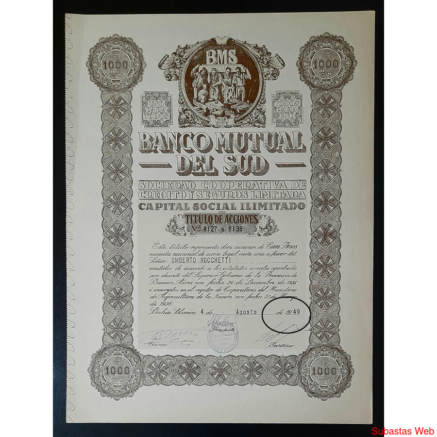 ARGENTINA. 1949 - ESPECTACULAR LOTE DE ****5 ACCIONES - TITULO AL PORTADOR DEL BANCO MUTUAL DEL SUD**** SOCIEDAD COOPERATIVA DE CRÉDITO Y SEGUROS LIMITADA.