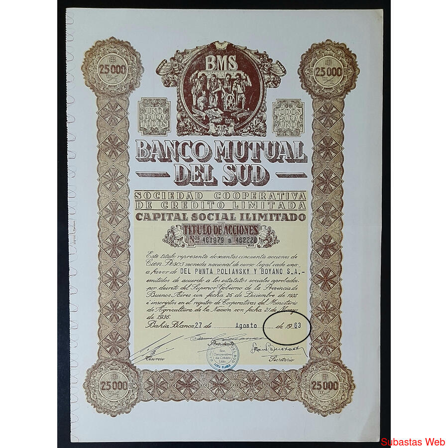 ARGENTINA. 1963 - ESPECTACULAR LOTE DE ****4 ACCIONES - TITULO AL PORTADOR DEL BANCO MUTUAL DEL SUD**** SOCIEDAD COOPERATIVA DE CRÉDITO LIMITADA.