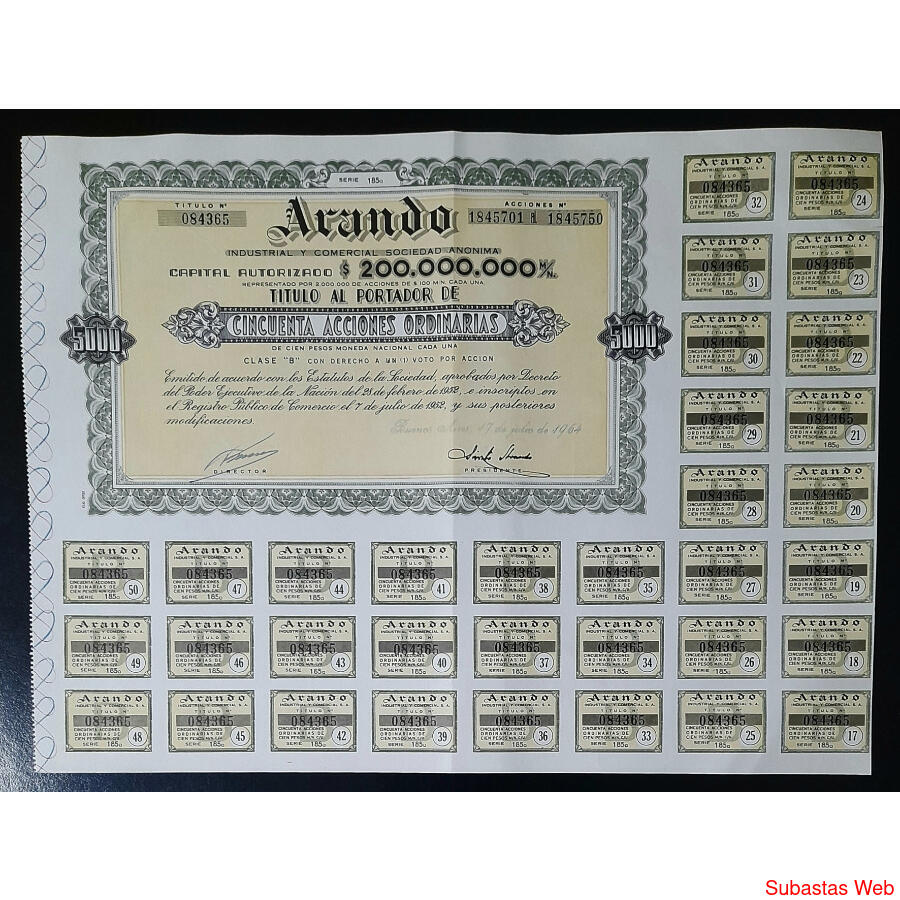 ARGENTINA. 1964 - ESPLENDIDO LOTE DE ****5 ACCIONES - TITULO AL PORTADOR DE "ARANDO"**** SOCIEDAD ANÓNIMA INDUSTRIAL y COMERCIAL