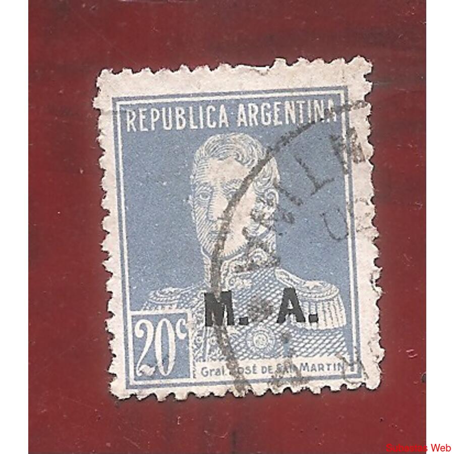 ARGENTINA 1923 SAN MARTIN SIN PUNTO, DENTADO: 13,5x12,5 SOBRECARGA MINISTERIAL: M.J.I. USADA, NROCAT: MT:304(211)