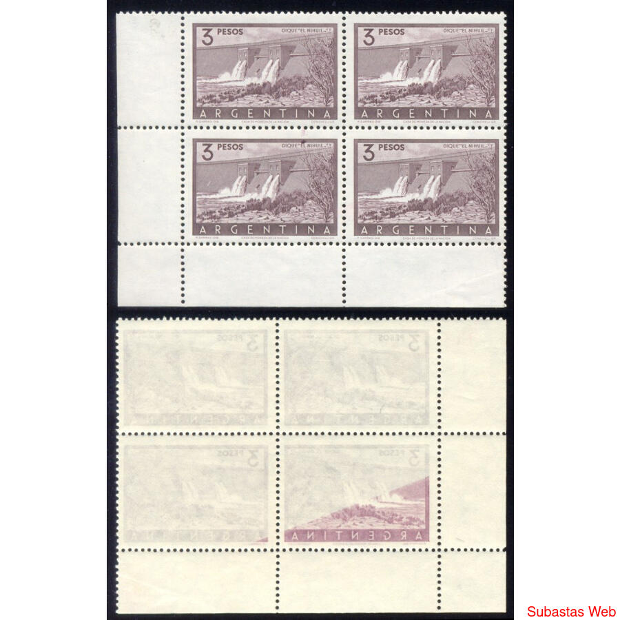 ARGENTINA. GJ 1050A - DIQUE EL NIHUIL. ESPLENDIDO CUADRITO MINT ESQUINA DE HOJA INFERIOR CON VARIEDAD:
