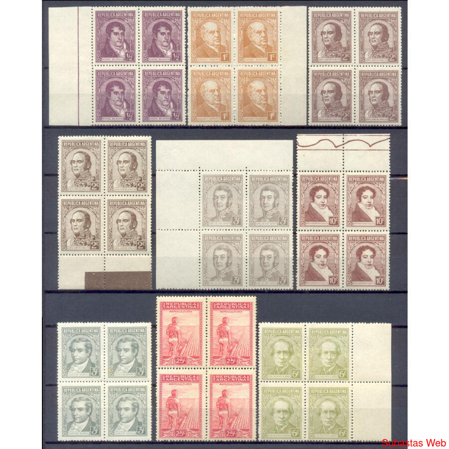 ARGENTINA. GJ802 (En adelante). 1936 / 1942. PRÓCERES y RIQUEZAS. LOTE de 9 CUADROS MINT DIFERENTES "SIN FILIGRANA" MAYORÍA BORDE DE HOJA.