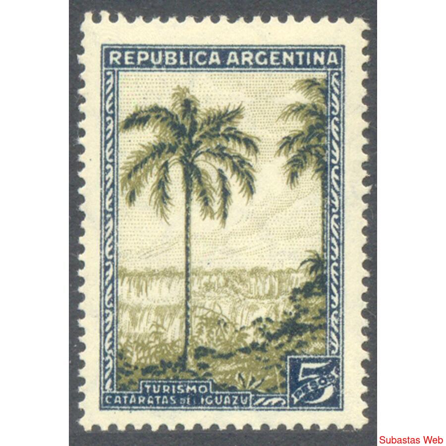 ARGENTINA. GJ763. PRÓCERES y RIQUEZAS. "CATARATAS DEL IGUAZÚ" 5 Pesos PIZARRA y VERDE OLIVA . NUEVO CON SUAVE RESTO DE BISAGRA