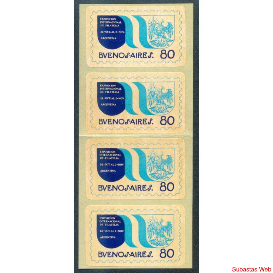 ARGENTINA. 1980 Viñetas de la "EXPOSICIÓN INTERNACIONAL DE FILATELIA Bs. As. 80". Tira x 4 ejemplares Mint Sin dentar sobre papel auto-adhesivo.