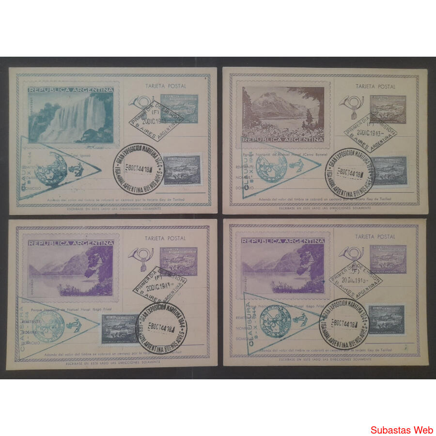 UNA de CADA DISEÑO + UNA DUPLICADA. TODAS ELLAS CON "GOMIGRAFO DE CLAUSURA DE LA LIGA NAVAL ARGENTINA DE LA EXPOSICIÓN MARÍTIMA 8 - X - 1944" en TINTA VERDE