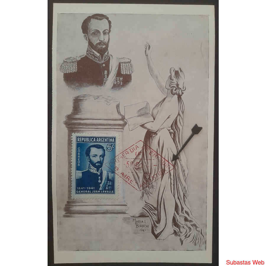 ARGENTINA. GJ 854 GENERAL JUAN LAVALLE. en RARA TARJETA MÁXIMA CON MATATASELLO **CON ERROR** PRIMER DÍA DE EMISIÓN