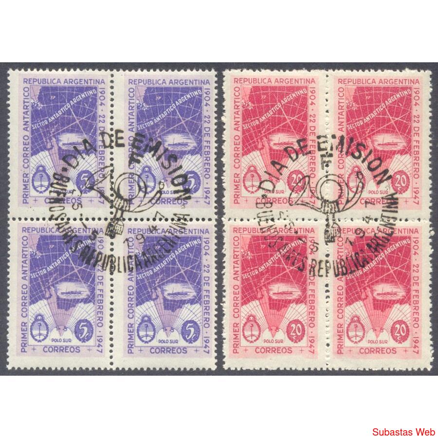 GJ943 / 944. "PRIMER CORREO ANTÁRTICO". SERIE COMPLETA SIN FILIGRANA EN CUADRITOS PRIMER DÍA DE EMISIÓN