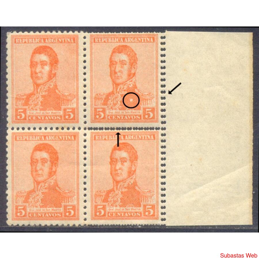 ARGENTINA. GJ 462. "SAN MARTÍN 5 cent SIN FILIGRANA" Dentado 13 1/4 x 12 1/2. CUADRO BORDE HOJA con TRIPLE VARIEDAD: