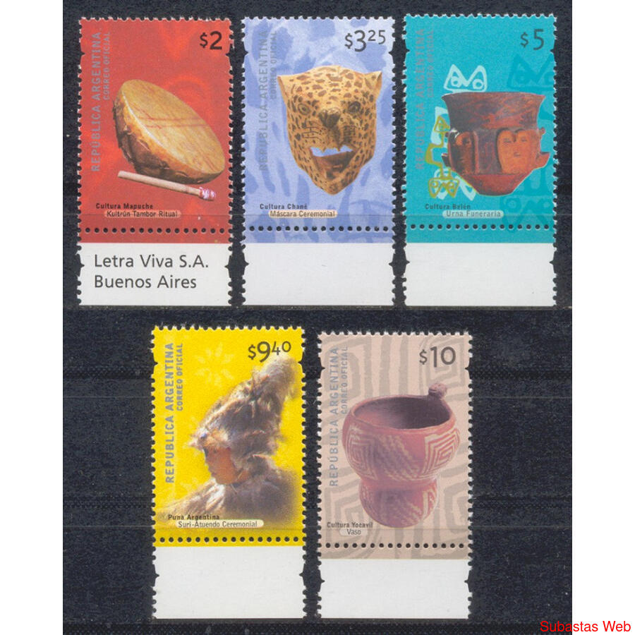 ARGENTINA. GJ3095/3098 + 3708 . SERIE BÁSICA - ARTE y CULTURA INDÍGENA- LOTE DE 5 VALORES MINT CON BORDE DE HOJA INFERIOR