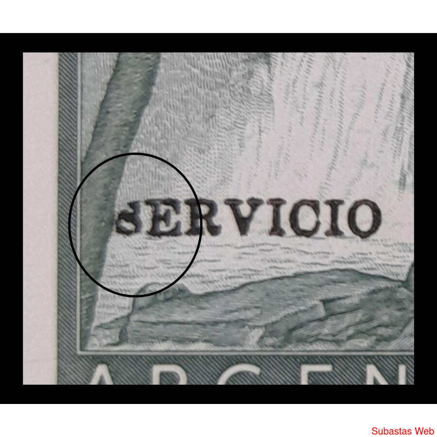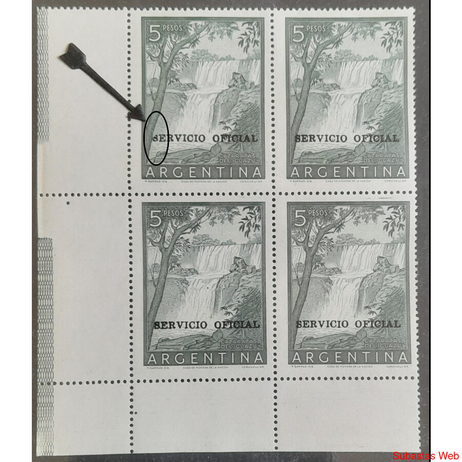 ARGENTINA. SERVICIO OFICIAL GJ SO724. CATARATAS DEL IGUAZÚ $ 5. ESPLENDIDO CUADRITO MINT ESQUINA DE HOJA CON VARIEDAD DE IMPRESIÓN EN LA SOBRECARGA: