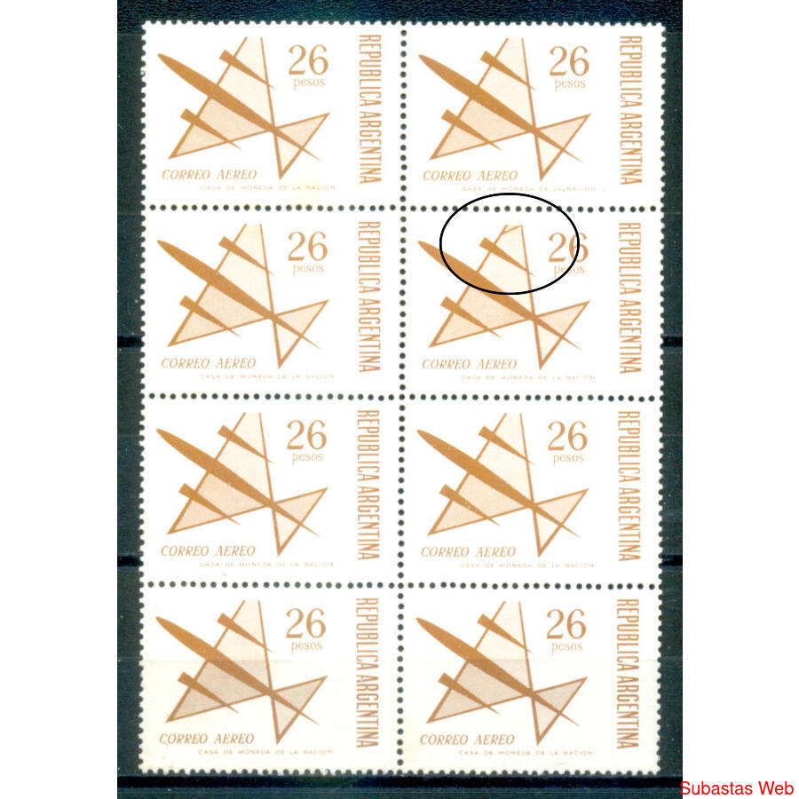 ARGENTINA. GJ1427a. EMISIÓN PARA CORREO AÉREO - AVIÓN ESTILIZADO SERIE BÁSICA. BLOQUE MINT x 8 EJEMPLARES, UNO CON VARIEDAD CATALOGADA: ***ALA ROTA***