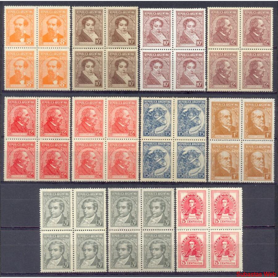 ARGENTINA. 1935 EN ADELANTE. PRÓCERES y RIQUEZAS. ESPECTACULAR LOTE de 19 CUADROS MINT (10) y NUEVOS R/B (9). TODOS DIFERENTES, YA SEA DIFERENTES IMPRESIONES, PAPELES y/o FILIGRANAS.