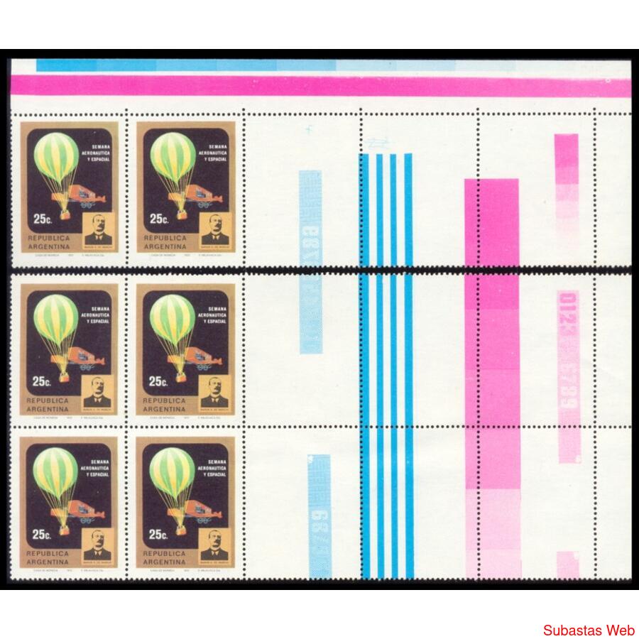 ARGENTINA. GJ1596CDT. "SEMANA AERONÁUTICA y ESPACIAL". ESPECTACULAR CUADRO BORDE DE HOJA MINT + GJ1596CDT PAREJA ESQUINA DE HOJA MINT, AMBAS PIEZAS CON: