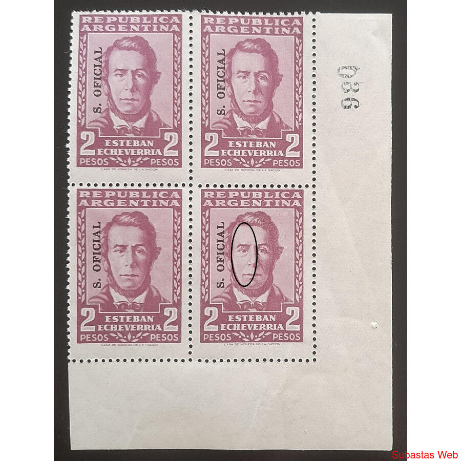ARGENTINA . SERVICIO OFICIAL. GJ712. ***ESTEBAN ECHEVERRIA*** CUADRO MINT ESQUINA DE HOJA CON ESCASA VARIEDAD AUN NO CATALOGADA: