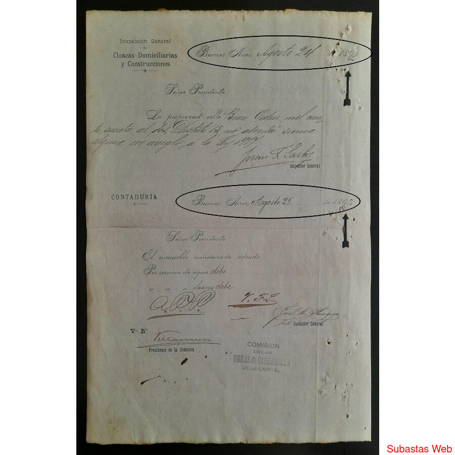 ARGENTINA 1892. ESPLENDIDA NOTA OFICIAL MUY VISTOSA DEL ***SEÑOR PRESIDENTE DE LA COMISION DE OBRAS DE SALUBRIDAD DE LA CAPITAL***