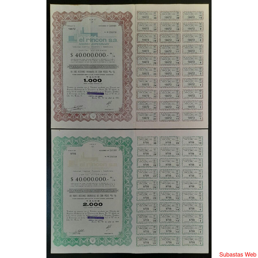 ARGENTINA. 1960 / 1961 - ESPLENDIDO LOTE DE ****5 ACCIONES - TITULO AL PORTADOR DE LA FIRMA EL RINCÓN SOCIEDAD ANÓNIMA - ACEROS ESPECIALES - COMERCIAL, INDUSTRIAL, FINANCIERA e INMOBILIARIA****