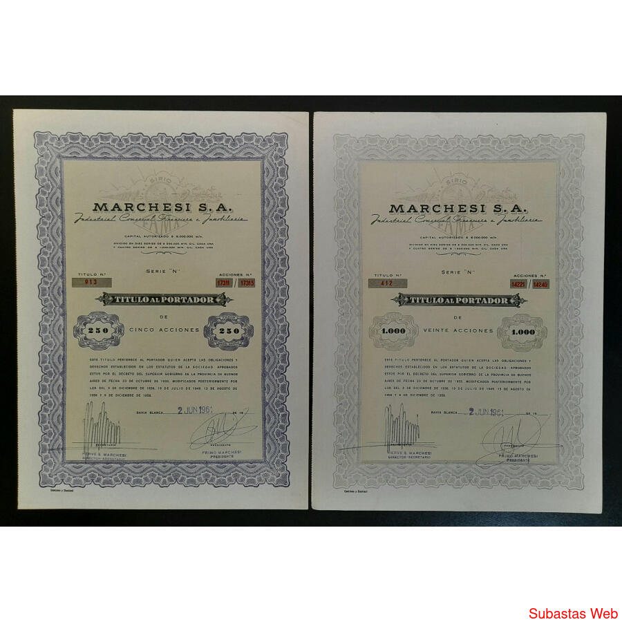 ARGENTINA. 1961 - ESPLENDIDO LOTE DE ****4 ACCIONES - TITULO AL PORTADOR DE LA FIRMA MARCHESI SOCIEDAD ANÓNIMA - COMERCIAL, INDUSTRIAL, FINANCIERA e INMOBILIARIA****