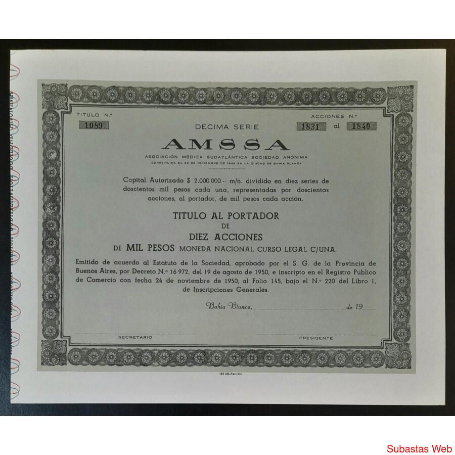 ARGENTINA. DÉCADA DEL '50 - ESPECTACULAR LOTE DE ****4 ACCIONES - TITULO AL PORTADOR DE LA FIRMA **** AMSSA - ASOCIACIÓN MEDICA SUD ATLÁNTICA SOCIEDAD ANÓNIMA****