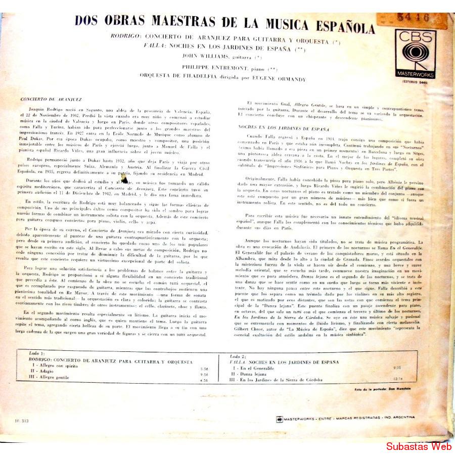 EXCELENTE VINILO LP."DOS OBRAS MAESTRAS DE LA MUSICA ESPAÑOLA"CONCIERTO DE ARANJUEZ Y NOCHES EN LOS JARDINES DE ESPAÑA INTERPRETADAS POR LA ORQUESTA DE FILADELFIA DIRIGIDA POR EUGENE ORMANDY.