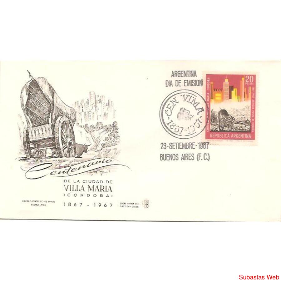 ARGENTINA 1967 SOBRE PRIMER DIA DE EMISION: CENTENARIO DE LA CIUDAD DE VILLA MARIA, SOBRE DEL CIRCULO FILATELICO DE LINIERS, NROCAT: MT796