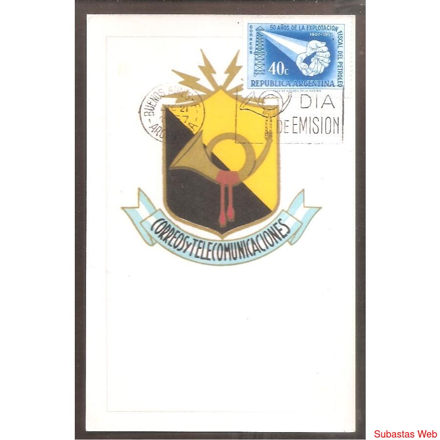 ARGENTINA 1957 TARJETA PRIMER DIA DE EMISION: CINCUENTENARIODE LA EXPLOTACION FISICA DEL PETROLEO EN ARGENTINA, TARJETA POSTAL DE CORREOS Y TELECOMUNICACIONES, NROCAT: MT580