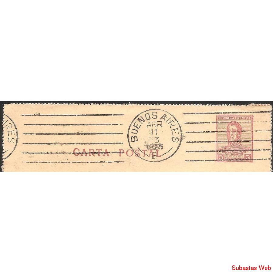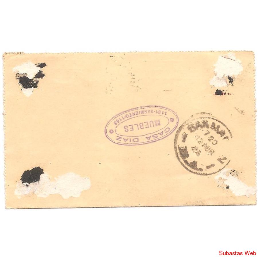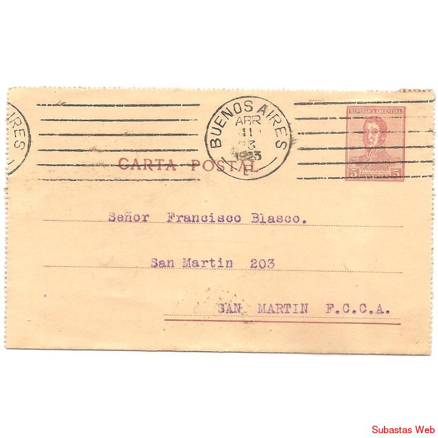 Carta Postal Circulada el 11 de Abril de 1923 de Capital Federal a San Martin (Buenos Aires), con sello postal impreso en el sobre San Martin 5 centavos (serie 1917). Matasellos al frente Buenos Aires y al dorso San Martin el 12/4/23