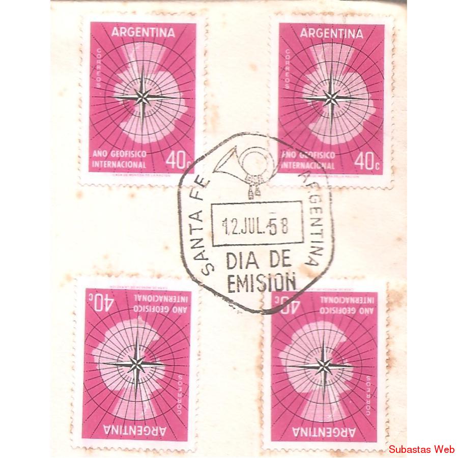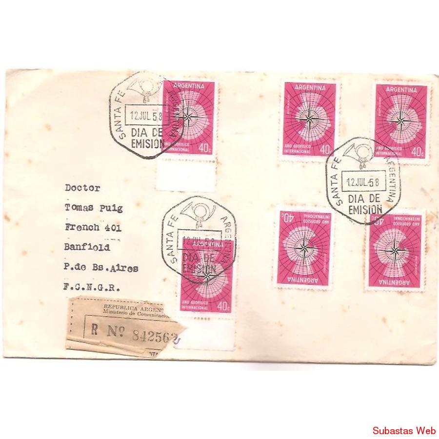 Sobre Circulado el primer dia de emision Desde Santa Fe a Buenos Aires. Franqueado con 6 sellos del Año Geofisico Internacional (mapa de Antartida). Matasellos de Primer dia de emision de Santa Fe, Certificada, al dorso nada