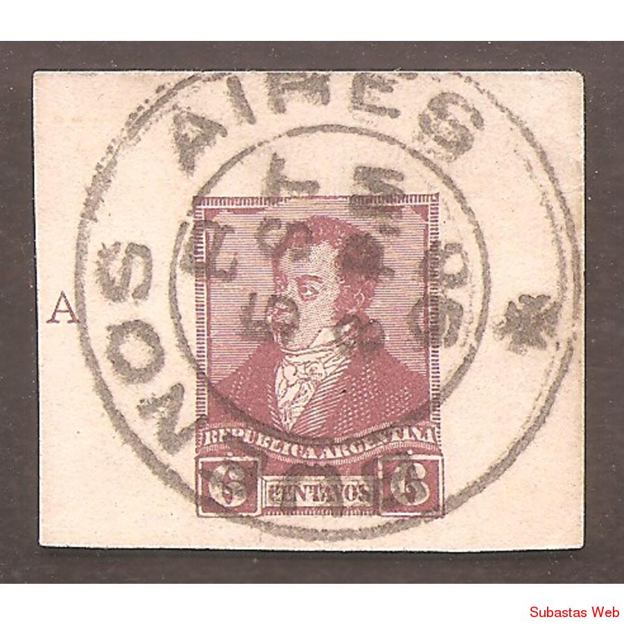 ARGENTINA 1892 3 PROCERES: RIVADAVIA DE 6 CENTAVOS, IMPRESION LISA, CORTADO DE TARJETA POSTAL 15, CON BUEN MATASELLO DE BUENOS AIRES DEL 5 DE SEPTIEMBRE DE 1896