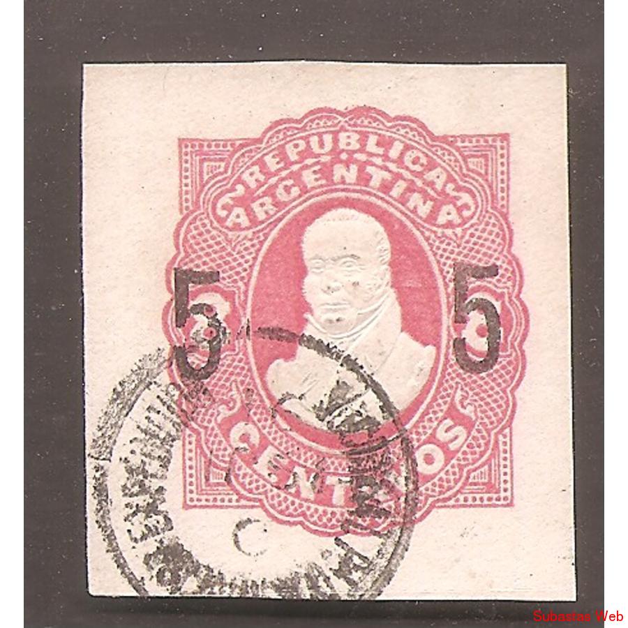 ARGENTINA 1890 CHICLANA DE 8 CENTAVOS SOBRECARGADO CON 5 DE TIPO 2 (TRAZO SUPERIOR DEL CINCO CURVADO), PAPEL LISO CON LISTADO DIAGONAL HACIA LA IZQUIERDA, CORTADO DE SOBRE POSTAL 28 (VALOR DEL SOBRE COMPLETO USADO SEDGUN CATALOGO JALIL u$s100)
