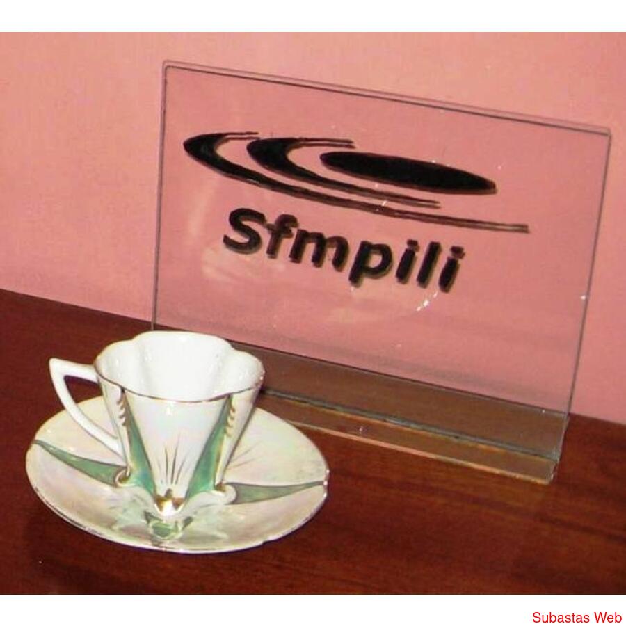 Un posillo con un platito porcelana decorado en verde y dorado