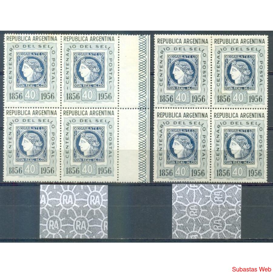ARGENTINA. GJ 1065 + 1065A CENTENARIO DEL SELLO DE CORRIENTES. 2 CUADRITOS MINT (1 BORDE DE HOJA) EN LOS DOS PAPELES: