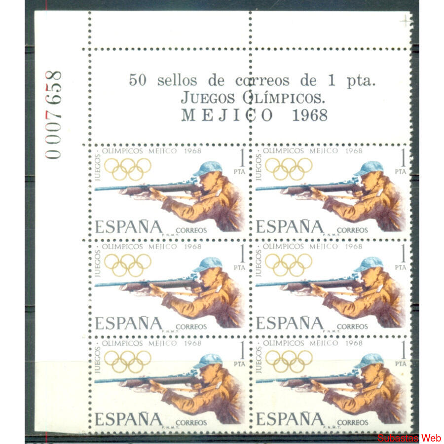 ESPAÑA. 1968. Scott 1543 - TIRADOR OLÍMPICO -ESTUPENDO BLOQUE ESQUINA DE HOJA x 6 EJEMPLARES MINT