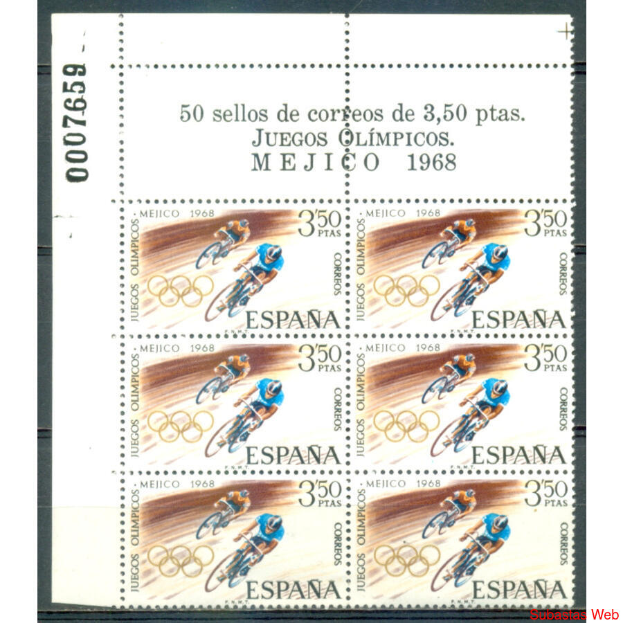 ESPAÑA. 1968. Scott 1545 - CICLISTA OLÍMPICO -ESTUPENDO BLOQUE ESQUINA DE HOJA x 6 EJEMPLARES MINT