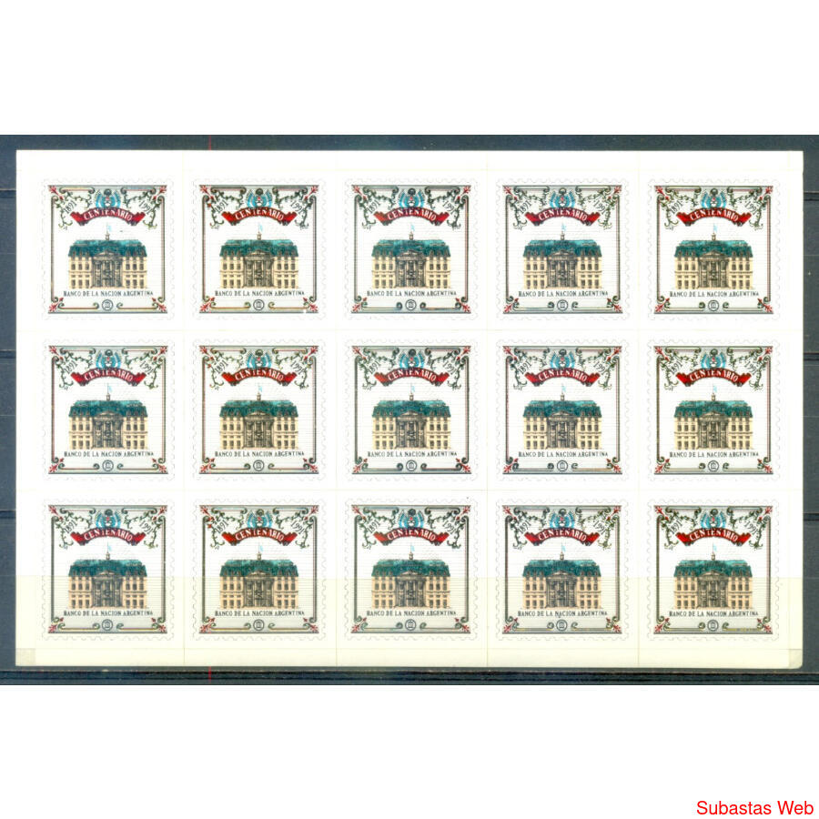 ARGENTINA. 1891 - 1991. Viñetas del "Centenario del Banco de la Nación Argentina". Esplendida Plancha Completa Mint. Sin dentar de 15 ejemplares. sobre papel auto adhesivo "Duro - jac - MM. 15 viñetas.