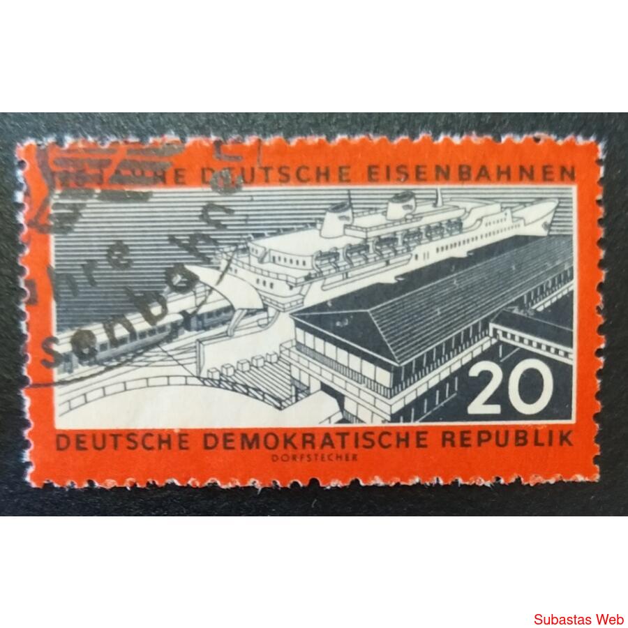 ALEMANIA DDR 1960; SCOTT 530, USADA, 125 Aniversario de los ferrocarriles alemanes, Estación de Sassnitz y ferry.