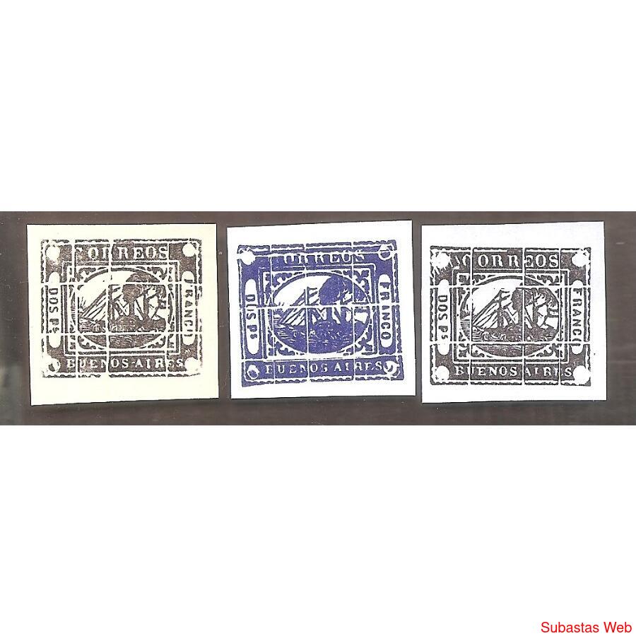 ARGENTINA 1858 BARQUITIS: EL 2 PS REIMPRESION DE M. PALEY, EN TRES TIPOS DE PAPELES Y COLORES, CRUZADOS CON LINEAS BLANCAS VERTICALES Y HORIZONTALES, ADQUIRIDOS EN SUBASTA DE GUILLERMO JALIL.