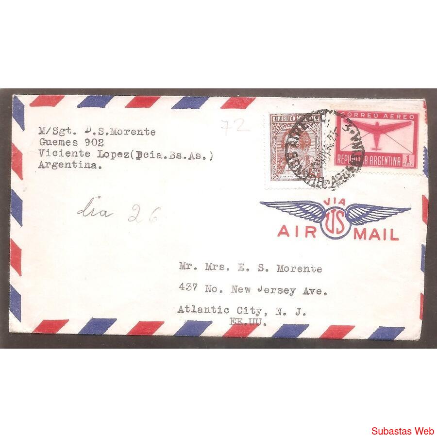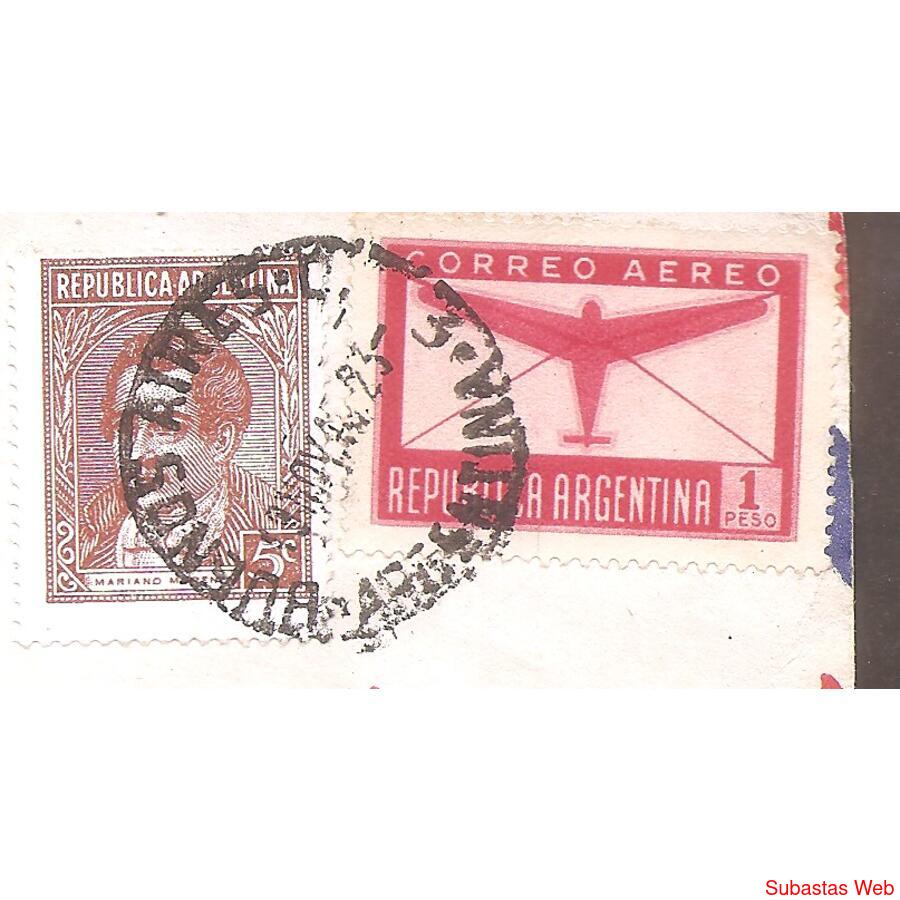 ARGENTINA 1940 Sobre CIRCULADO EL 13 DE NOVIEMBRE DE 1940 DE BUENOS AIRES A ATLANTIC CITY, ESTADOS UNIDOS, MATASELLOS BUENOS AIRES , FRANQUEO UN SELLO AEREO DE 1 PESO Y ORDINARIO: MORENO DE 5 CENTAVOS, AL DORSO NADA