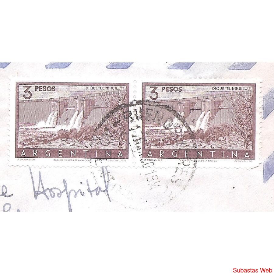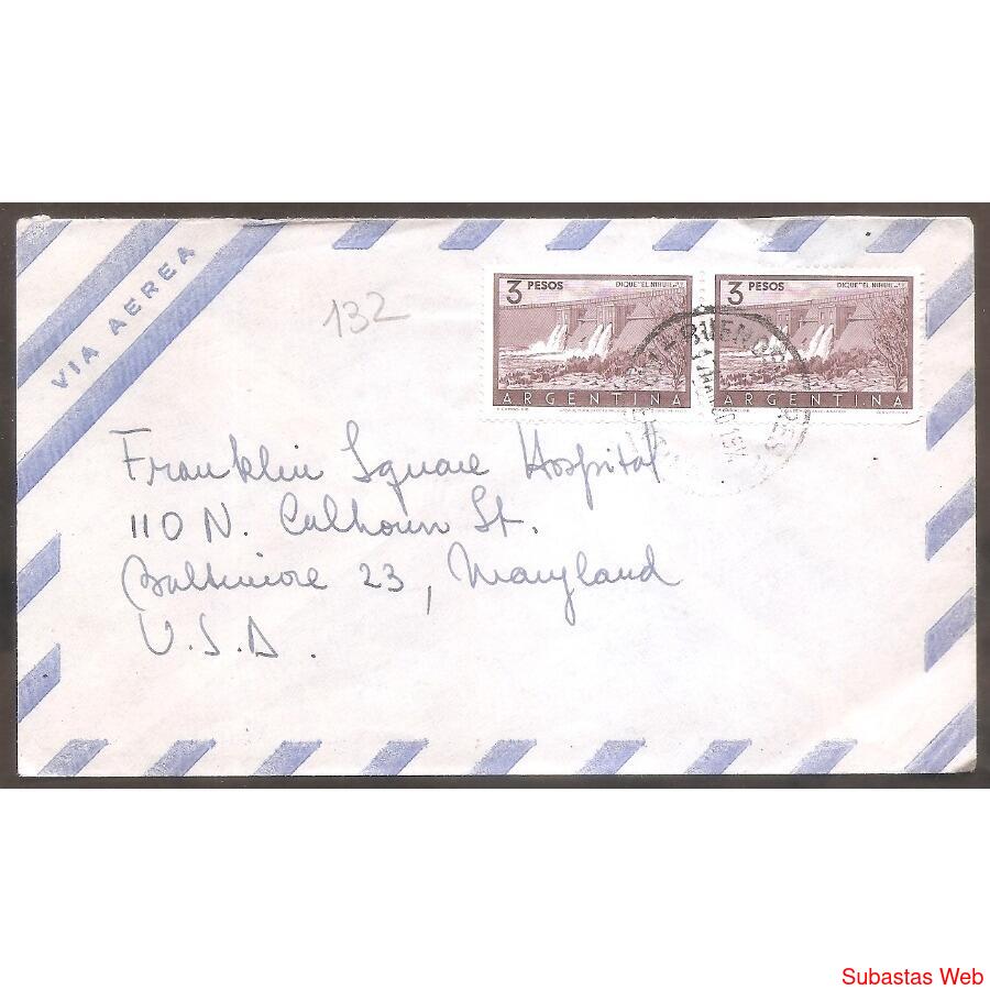 ARGENTINA 1960 SOBRE CIRCULADO EL 17 DE MARZO DE 1960 DE BUENOS AIRES A BALTIMOR, MARYLAND ESTADOS UNIDOS, FRANQUEO: DOS SELLOS CORREO ORDINARIO: DE $3 DIQUE EL NIHUIL, MATASELLOS DE BUENOS AIRES, AL DORSO NADA