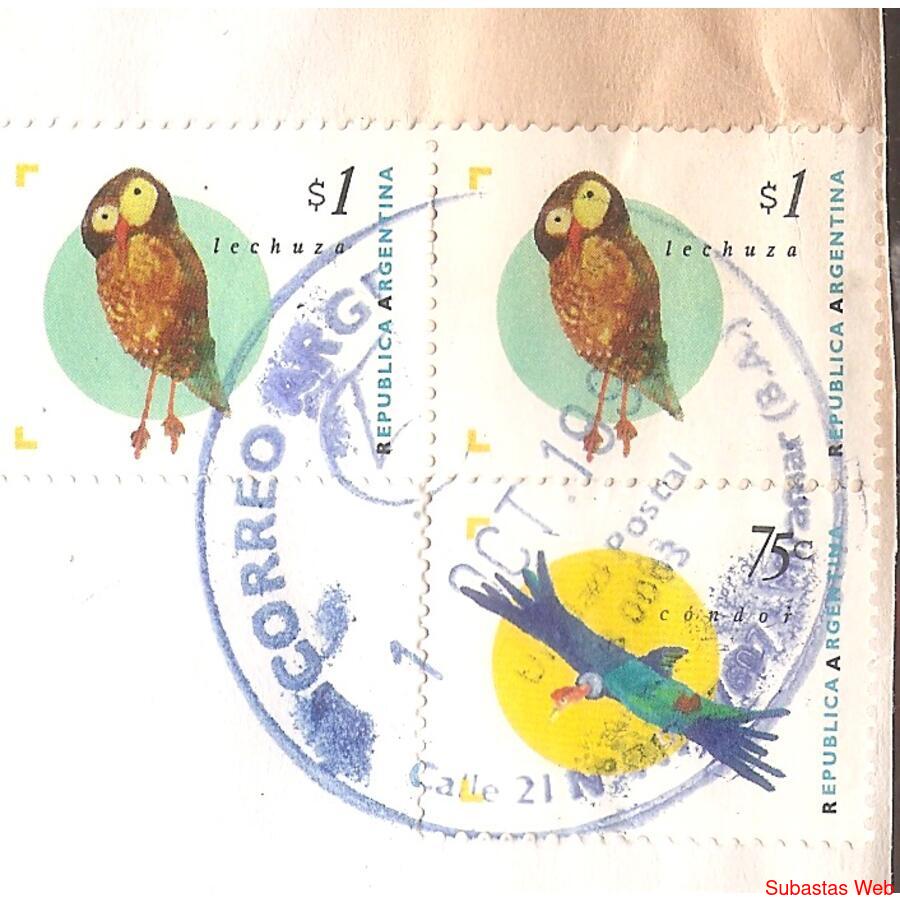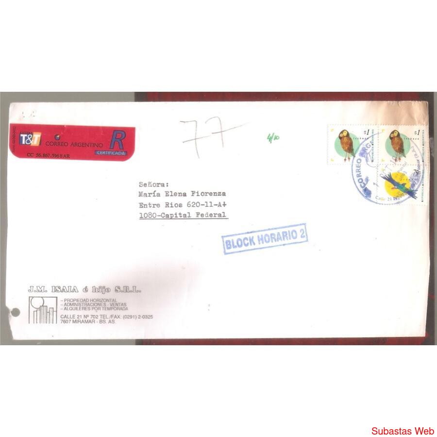 ARGENTINA 1996 Sobre de la Administracion e Inmobiliaria ISAIA, Circulado el 1 de Octubre de 19996, desde Miramar (Buenos Aires) a Capital Federal, Franqueo: 3 sellos de Correo Ordinario Pajaros: Lechuza y Condor