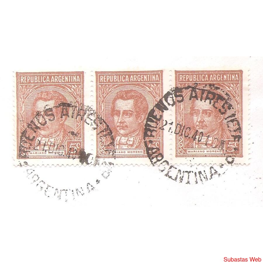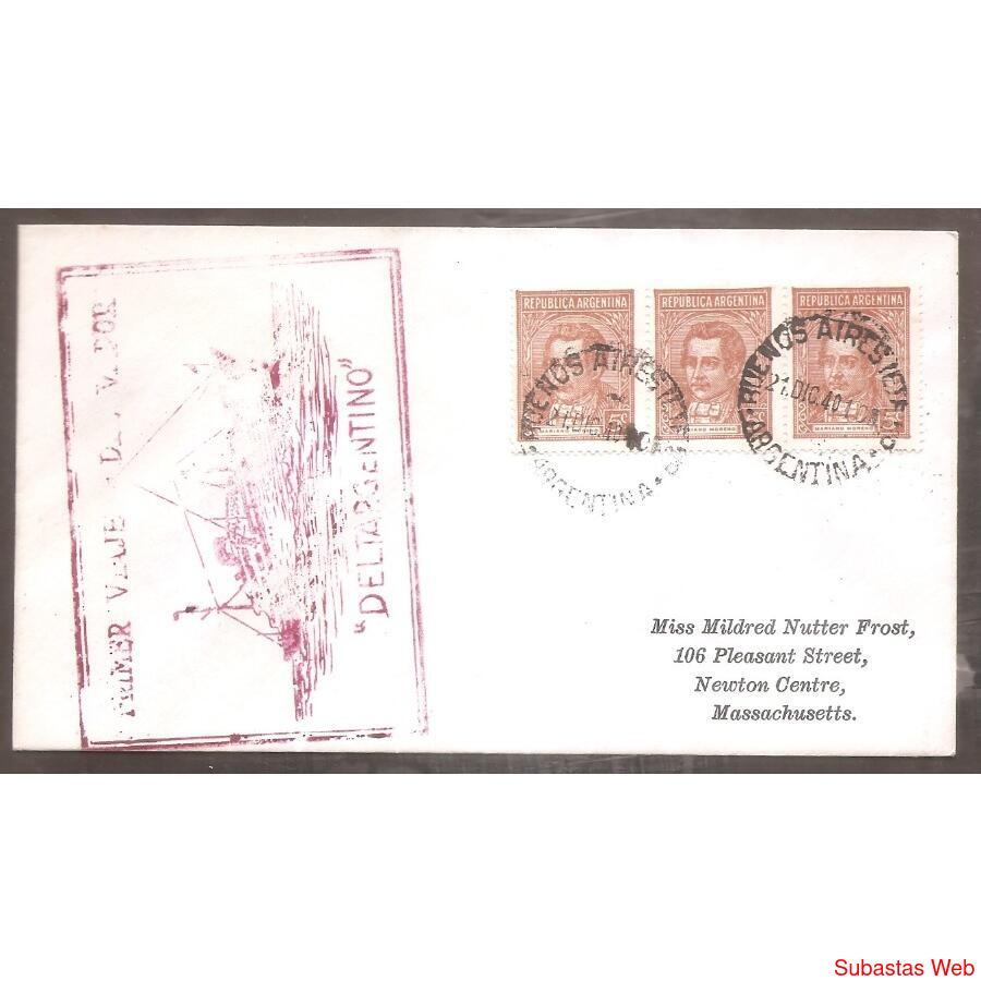SOBRE CIRCULADO DE BUENOS AIRES A NEWTON CENTRE MASSACHUSET USA, EL 21 DE DICIEMBRE DE 1940, FRANQUEO: PROCERES NACIONALES: 3 SELLOS DE MORENO DE 5 cvts., MATASELLO DE BUENOS AIRES, SOBRE ALUSIVO AL PRIMER VIAJE DEL VAPOR: DELTA ARGENTINO. AL DORSO NADA