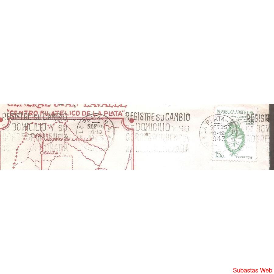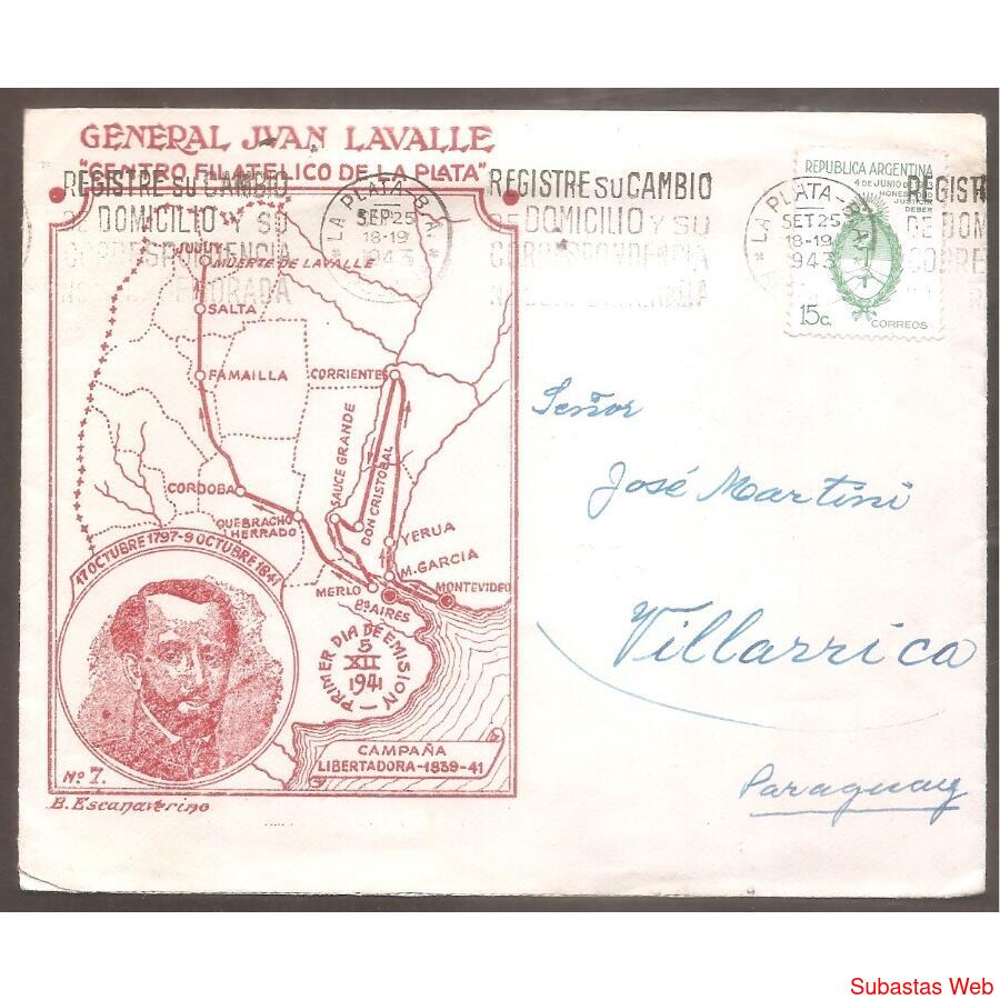 SOBRE CIRCULADO DE LA PLATA A VILLARICA PARAGUAY, EL 25 DE SEPTIEMBRE DE 1943, FRANQUEO: CONMEMORACION DE LA REVOLUCION DEL 43 ESCUDO DE 15ctvs. SOBRE DEL CENTRO FILATELICO DE LA PLATA, CONMEMORATIVO DE JUAN LAVALLE. MATASELLO BANDELETA DE LA PLATA, AL DORSO MATASELLOS DEL PARAGUAY Y OTRO SELLO TIPO BANDELETA POCO CLARO