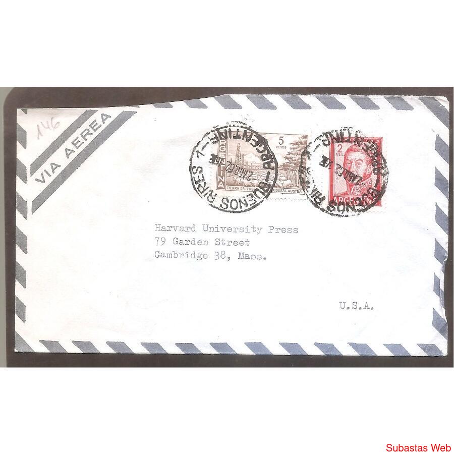 SOBRE CIRCULADO EL 2 DE AGOSTO DE 1962 DESDE BUENOS AIRES A CAMBRIDGE – MASSACHUSET ESTADOS UNIDOS, FRANQUEO: PROCERES Y RIQUEZAS: TIERRA DEL FUEGO Y SAN MARTIN, AL DORSO REMITENTE